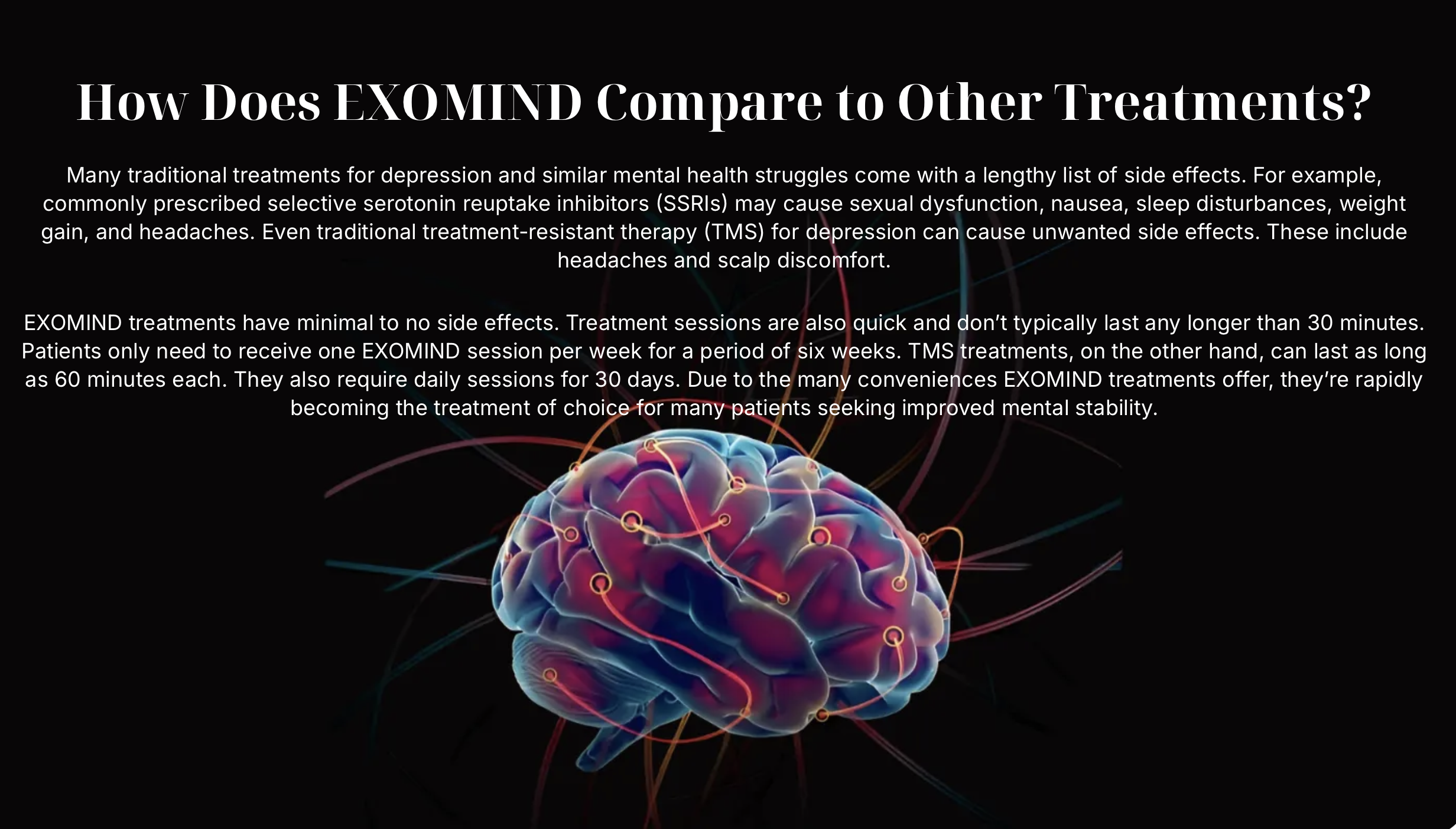 Though EXOMIND studies are still preliminary, they reveal exceptional treatment results. Initial information shows EXOMIND treatments have a powerful positive effect on mental well-being, mood, and self-control. Watch for additional EXOMIND studies and treatment information to come out in the coming months and years. Keep in mind that individual treatment results may vary.*